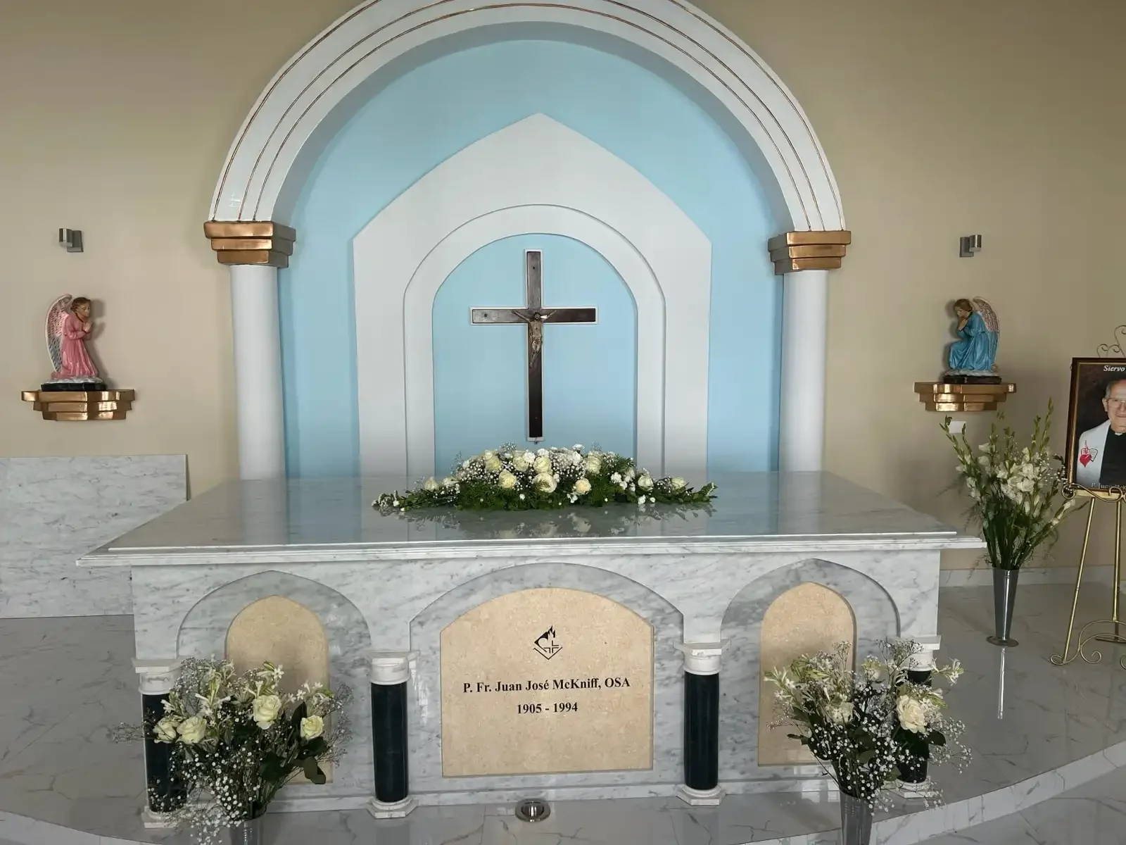 Following a Mass of Thanksgiving, Fr. John was laid to rest in a side chapel of the church, this time encased in a beautiful marble sarcophagus adorned with white flowers.